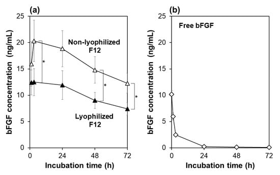 Variations of bFGF concentration with incubation time up to 72 h in the acellular medium supplemented with (a) the non-lyophilized (white triangles) or lyophilized (black triangles) F12 membrane, or (b) 10 ng/mL of free bFGF (average ± SD; n = 3; * p < 0.05).