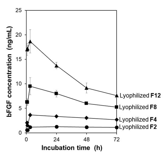 Variations of bFGF concentration with incubation time up to 72 h in the acellular medium supplemented with the lyophilized F2, F4, F8, and F12 membranes (average ± SD; n = 3).