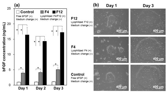 The lyophilized F4 and F12 membranes allowed sustained release of bFGF in the culture medium of iPSCs as well as in the acellular medium. In the control group (see white bars in Figure 5a), the residual bFGF concentration in the bFGF-containing medium diminished from 10 ng/mL to approximately 1 ng/mL at the time of daily medium refreshment (1 day after the preceding refreshment with the bFGF-containing medium). In contrast, the bFGF concentration in the medium remained around 5 ng/mL (in the F4 group) or 15 ng/mL (in the F12 group) on Days 1, 2, and 3 during the continuous culture without medium refreshment (see gray and black bars in Figure 5a). This was due to the sustained release of bFGF from the lyophilized membranes as described in Section 3.2. These results suggest that the sustained bFGF release from the lyophilized membranes is hardly influenced by the presence of iPSCs, similar to the non-lyophilized membranes [18]. Note that the residual rate of bFGF in the bFGF-containing medium with iPSCs was higher (approximately 10% on Days 1, 2, and 3, from Figure 5a) than that without cells (approximately 2% at 24 h, from Figure 3b). A similar phenomenon was reported in our previous study [18]. The increased bFGF concentration in the presence of iPSCs was likely caused by autocrine bFGF [26] and/or bFGF-stabilizing molecules (such as heparin [9,13,17]) from iPSCs. Extracellular matrix components and other biomolecules from iPSCs may also increase the residual bFGF concentration through nonspecific adsorption onto the well surface, which reduces bFGF adsorption.