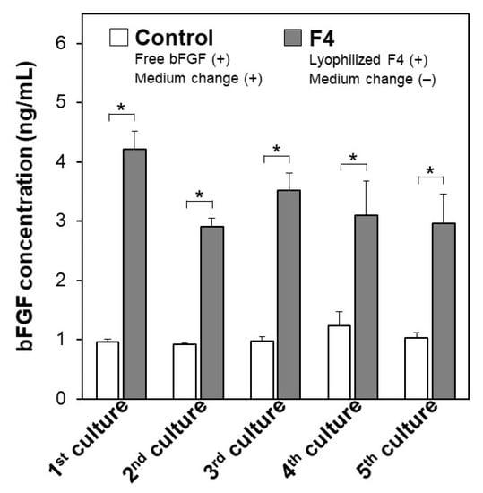 Concentrations of bFGF in the culture medium of human iPSCs, on Day 3 in repeated (up to 5 times) cycles of the medium-change-free continuous culture with the lyophilized F4 membrane (F4 group; gray bars) or of standard culture using bFGF-containing medium with daily medium refreshment (control group; white bars) (average + SD; n = 3; * p < 0.05).