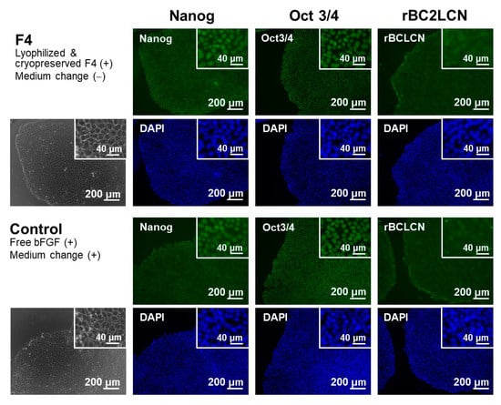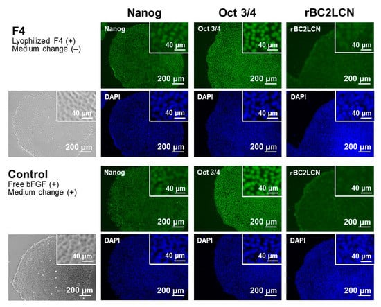 Phase contrast (leftmost column) and fluorescence (right 3 columns) microscopic images of human iPSCs on Day 3 in medium-change-free continuous culture with the lyophilized and cryopreserved (3 months) F4 membrane (F4 group; upper 2 rows) or in standard culture using bFGF-containing medium with daily medium refreshment (control group; lower 2 rows). The iPSCs were stained with FITC (green)-conjugated anti-Nanog, anti-Oct 3/4, and rBC2LCN, and their nuclei were counterstained with DAPI (blue). Insets show higher magnification images.
