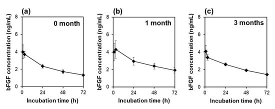 The sustained bFGF release of the lyophilized F4 membrane did not change for as long as 3 months when cryopreserved at −30 °C. As revealed by a preliminary bFGF-release test using acellular medium, the lyophilized F4 membrane provided similar release profiles of bFGF irrespective of the period of cryopreservation up to 3 months (Figure 8). These results suggest that bFGF molecules adsorbed on the lyophilized F4 membrane were resistant to conformational change in an ordinary medical freezer at −30 °C.