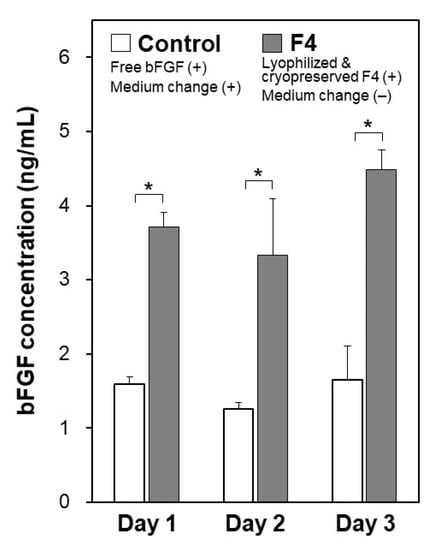 Concentrations of bFGF in the culture medium of human iPSCs on Days 1, 2, and 3 in medium-change-free continuous culture with the lyophilized and cryopreserved (3 months) F4 membrane (F4 group; gray bars) or in standard culture using bFGF-containing medium with daily medium refreshment (control group; white bars) (average + SD; n = 3; * p < 0.05).