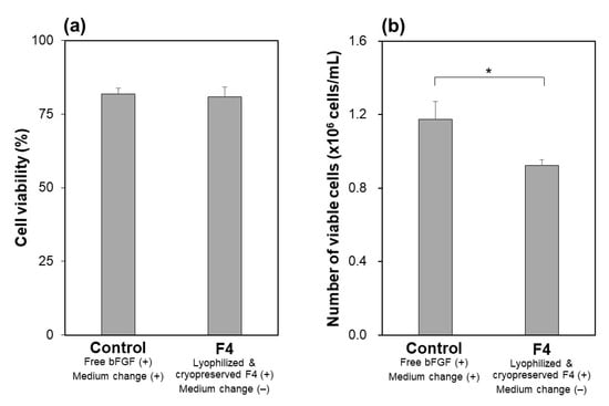 (a) Viability of iPSCs and (b) relative number of viable iPSCs on Day 3 in medium-change-free continuous culture with the lyophilized and cryopreserved (3 months) F4 membrane (F4 group) or in standard culture using bFGF-containing medium with daily medium refreshment (control group) (average + SD; n = 3; * p < 0.05).