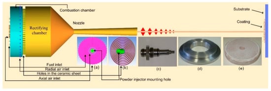The model structure and spraying mechanism are shown in Figure 1. When the spray gun is working, the compressed air and propane are separately injected into the combustion chamber in a discrete form. After ignition of the AC-HVAF gun, the ceramic sheet is preheated up to the auto-ignition temperature of the mixture gas; then, the high temperature ceramic sheet is used as catalytic medium to continuously ignite the mixture, which is called activate combustion. The combustion products enter the rectifying chamber through hundreds of orifices of ceramic sheets and are axially injected with the nitrogen pre-mixed powder particles, which are accelerated in the nozzle to hit the substrate and form a coating.