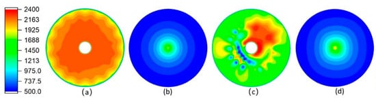 Figure 4 shows the temperature fields of the combustion chamber and the substrate formed using different mesh cells. Comparing Figure 4a,c it can be seen that the temperature field obtained using the fourth meshes has better symmetry than that using the first meshes. After comprehensive comparison of Figure 4a-d, it becomes clear that the asymmetry of temperature field in the combustion chamber affects the subsequent flow field when the first meshes are adopted, and this effect decreases with the large-gradient change in the subsequent flow field. In fact, the other physical quantities such as velocity and composition in the combustion chamber are also distributed asymmetrically when the first meshes are adopted.