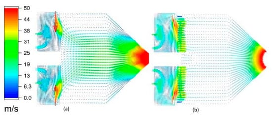 Internal velocity vector diagram of the spray gun: (a) second meshes and (b) fourth meshes.