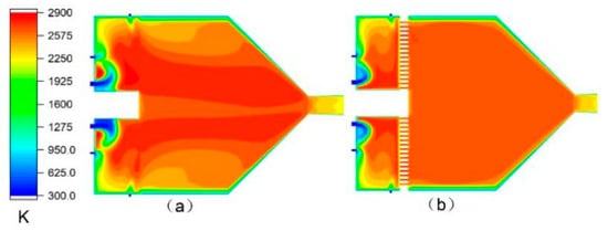 Figure 5 and Figure 6 show the comparisons of velocity and temperature with and without a ceramic sheet in the case wherein the other parameters are the same. It is clear that the ceramic sheet has a rectification effect on the airflow. The velocity and temperature of the airflow through the ceramic sheet are more uniform. Further, it can be seen in Figure 5 that the ceramic sheet increases the vortexes in the combustion chamber and prevents the fluid element with high radial velocity from passing, which increases the residence time and stroke of these fluid elements in the combustion chamber as well as the reaction probability between the fuel and the oxidant. This reduces the production of harmful gases such as CO and NOx that are discharged from the gun, which leads to efficient combustion and reduces the energy consumption.