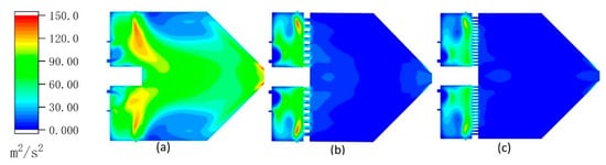 Figure 7 shows the difference of the turbulent kinetic energy inside the spray gun of three different configurations. As shown in this figure, the ceramic sheet effectively reduces the turbulent kinetic energy inside the spray gun, and the smaller the holes in the ceramic sheet, the smaller the turbulent kinetic energy after the region of the ceramic sheet. The lower turbulent kinetic energy of the flow is conducive to reducing the internal kinetic energy consumption of the airflow, so the higher airflow velocity appears at the muzzle, which is demonstrated by the curves in Figure 8b.