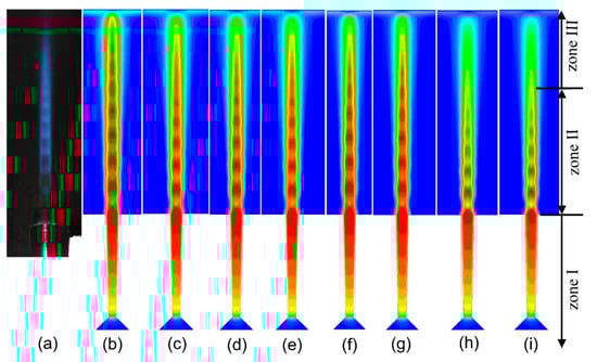 The flame of the actual spray gun and the partial contours of the airflow velocity: (a) actual spray gun, (b–i) experimental scheme corresponding to Table 1.