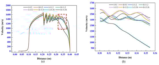Figure 12a,b show that the degree of fuel excess of each experiment, and Figure 12c implies that the chemical reaction basically ends in the combustion chamber, which satisfies the previous assumption. Obviously, the reaction products of different chemical reactions are different because of the excessive fuel. If the two-step method is used, the excess C3H8 generates CO, so the average density of the gas is lower than the one-step method. The higher the airflow density, the higher the momentum at the same velocity, and the state of the airflow motion is less susceptible to interference by the air from the external flow field. Therefore, the difference in the density of the airflow causes a significant velocity variation after the shock wave, which is the reason that the airflow of I-9.5 has the more stability of the velocity than the one of II-9.5.