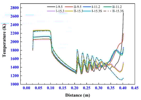 Figure 11 shows the change of airflow temperature along the axis. The negligible difference in temperature between different chemical reactions can be seen in all zones except for I-9.5 and II-9.5. However, the differences between them are limited to zone III. As shown in Figure 11, the temperature fields near substrates in zone III show an obvious difference in different experiments, which is mainly attributed to two factors: different degrees of compression effect and released heat by the combustion between the remaining fuel and the oxygen from the external. Figure 12 provides a good proof of this phenomenon.