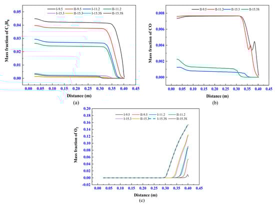 Mass fraction of gas species at the axis of the model: (a) C3H8, (b) CO, and (c) O2.