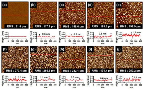 AFM topography images and line−scans of (a) cleaved mica and PDA/mica prepared by immersion for different times: (b) 60, (c) 90, (d) 120, (e) 150, (f) 180, (g) 210, (h) 300, (i) 420, and (j) 540 s, respectively. The line−scans are presented below each topography image.