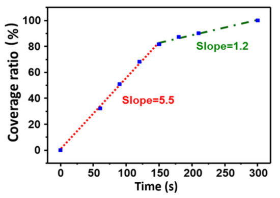 Figure 2 shows the coverage ratio at different immersion times. There are two linear stages including (1) the steep increase of coverage ratio within less than 150 s of immersion time and (2) the slight increase of coverage ratio at longer immersion times. The steep curve appeared because of rapid adsorption of the PDA molecules on the empty space of the cleaved mica surface. The region of slight increase is possibly due to the large diffusion resistance due to the self-aggregation of PDA particles and the small gaps in the coating.