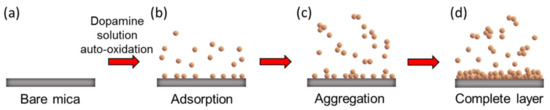 Thus, the mechanism of PDA deposition on the cleaved mica can be proposed as illustrated in Figure 3. Initial immersion of the mica surface into fresh alkaline DA solution led to the diffusion of DA molecules on the cleaved mica surface (Figure 3b). Diffusion of the DA molecules on the surface might be attributed to the interaction capability of the anchoring groups. In this stage, DA molecules would be present on the surface as well as in the solution. Afterward, simultaneous initiation of autoxidation and further polymerization of DA molecules would result in the presence of PDA on the surface and in solution. The generated PDA molecules would thus further act as seeding materials for enhancing the overall autoxidation of the DA molecules. Therefore, DA would be converted to PDA more rapidly, with simultaneous growth over time. Because PDA molecules have a large number of anchoring groups with strong interactions compared to their monomer counterpart, a simultaneous increase in the surface coverage of the PDA molecules was observed. At longer immersion times, the PDA molecules/particles aggregates became larger and deposited slowly into the gaps or on the deposited PDA molecules/particles (Figure 3c) [8,36], and finally deposition of molecules was completed to generate a complete PDA layer (Figure 3d). The adsorption and coating of PDA on mica, explained by the Volmer–Weber growth model, can be further summarized in a stepwise manner as (1) PDA molecules were adsorbed on the mica surface and served as the seeding materials, (2) other PDA particles were adsorbed around the seeding materials to form island-like PDA particles, and (3) other available PDA particles were deposited in the gaps between the island-like particles or on the surface of the native particles.