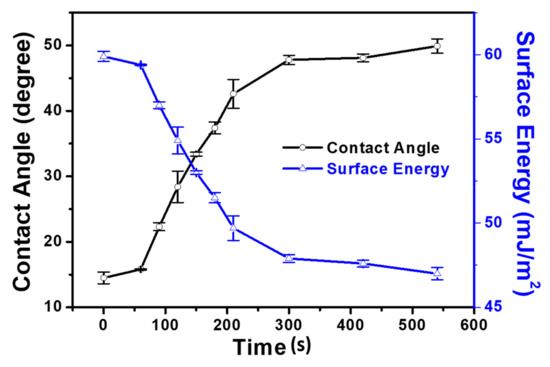 To obtain further insight into the formation of the PDA film on the mica surface, we further investigated the nature of the coated surface. Evaluation of the water contact (WCA) is one of the most common methods of measuring the surface wettability. Therefore, a wettability test was performed to explore the hydrophobicity and/or hydrophilicity of the PDA-coated mica surface. The WCA and surface energy were plotted as a function of the immersion time (0 to 540 s), as presented in Figure 4. For immersion times shorter than 300 s, the WCA increased dramatically, with concomitant and rapid reduction of the surface energy. However, immersion times greater than 300 s led to less dramatic variations in the WCA and surface energy. Only slight changes were observed when the immersion time was longer than 300 s. Such variations adequately explain the significant changes in the hydrophobicity of the PDA-coated mica surface. Specifically, the hydrophobicity of the mica surface was significantly enhanced. Such a significant increment in the hydrophobicity of the mica surface may be attributed to the structural signatures of the PDA molecules, where π-π interactions and hydrogen bonding interactions among molecules dominantly occurred during film formation. Upon reaching a certain molecular population threshold on the mica surface, the hydrophobicity could enhance slightly. For these reasons, a slight increment in the WCA and slight decrement in the surface energy was observed for immersion times longer than 300 s. Notably, coverage of the mica surface by PDA molecules was achieved within 300 s, which further validates the morphological signatures obtained by AFM.