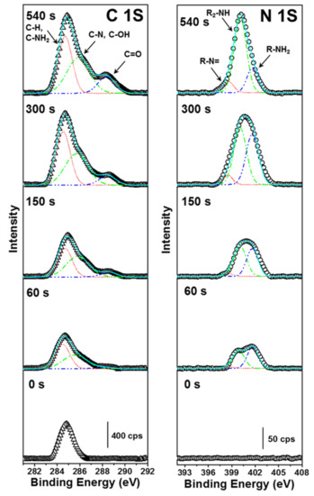 Table 2 shows the peak integral values of different functional groups under different immersion times. The increased intensity of C=O was attributed to the formation of intermediate species and tautomers (Figure A1). The C 1S region includes more than one component at the same binding energy (285.8 eV), including C–OH and C–N functionalities. Therefore, the discussion presented herein mainly focuses on the N 1S peak intensities. A close look at the chemical structure of PDA [13,39] reveals that the R–NH2 group belongs to dopamine, while R2–NH is found in both the intermediate and PDA. The R–N= functional group corresponds to the dopaminechrome and tautomeric species. These intermediate species might be 5,6-dihydroxyindole and 5,6-indolequinone. The peak intensity of R–NH2 decreased with increasing immersion time. This is because of the conversion of dopamine into reaction intermediates and tautomeric species via oxidation and cyclization. Specifically, increasing the immersion time increased the population of R–N= species relative to that of dopaminechrome formed through the oxidation of leuco-dopaminechrome; the tautomeric species were 5,6-dihydroxyindole and 5,6-indolequinone (Figure A1). Furthermore, the components with R2–NH groups grew to the highest value in N 1S region under immersion time longer than 150 s. This could be related to the formation of PDA. Thus, the PDA film contained not only PDA, but intermediates and tautomeric species, as well as dopamine.