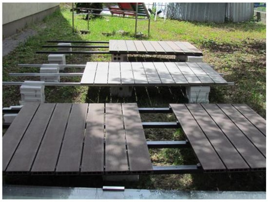 - aging in natural conditions (further marked as “outdoor exposure”). Three mocks made of decking profiles screwed to composite ground beams were prepared in the test station in natural conditions, on the supports made of hollow bricks. After three years of exposure, the test samples were cut out from the profiles. The arrangement of the samples during the test in natural conditions is shown in Figure 2.