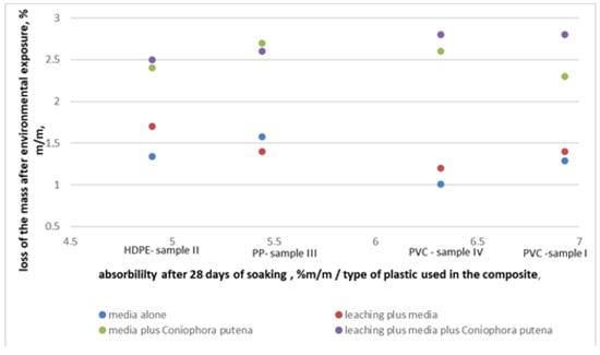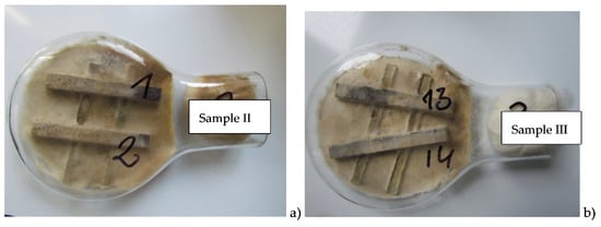 - leaching—14 days + 16 weeks of exposure to high humidity and culture medium (further marked as “leaching plus media”). The samples were immersed in water at (20 ± 2) °C for 14 days, according to the description given in EN 84 [36]. The samples were soaked in water, five volumes of water for one volume of sample, for two weeks. The water was replaced nine times during the cycle. After the end of the cycle, the samples were placed in flasks on maltose agar medium and incubated in the culture chamber at (22 ± 2) °C and (70 ± 5)% for 16 weeks. The leaching aging test according to EN 84 [36] is obligatorily used in tests of impregnated wood for exterior applications;