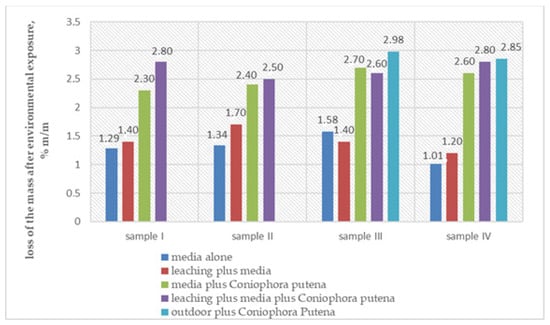 | Test Sample | Average Mass Loss after Exposure to % m/m/Coefficient of Variation [%] | ||||