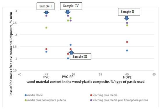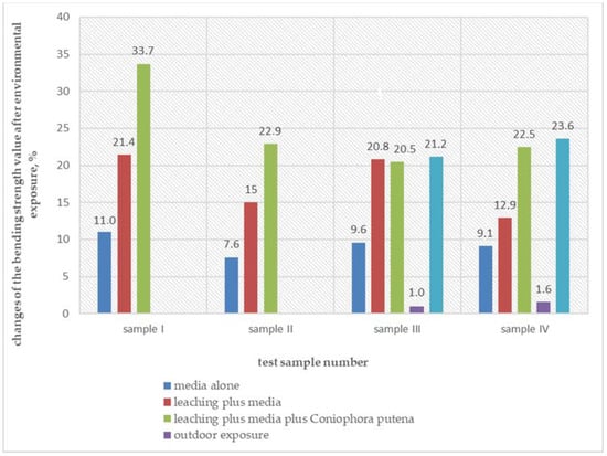 - exposure to high humidity and culture medium and Coniophora puteana fungus action—16 weeks,
