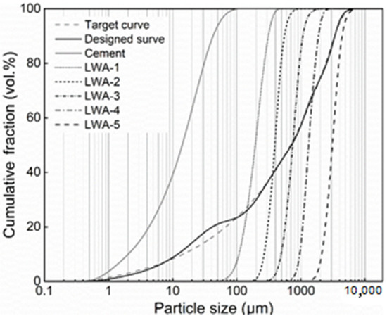 where P(D) is the fraction of total solid materials with particle sizes lower than D (μm). Dmin and Dmax are the smallest and largest particle sizes (μm), which are 0.4 and 4000 μm, respectively. q is the distribution modulus. By optimizing q values, which determine the particle size proportions of concrete. A larger q results in a coarser mixture and a recommended q value is in the range of 0–0.4 [39,40]. In order to achieve a targeted strength as well as a low density of LWAC, a relatively large q is chosen as 0.35 for all mixtures. The PSDs of the target curve and the resulting integral grading curve (designed curve) of the mixture are shown in Figure 1.