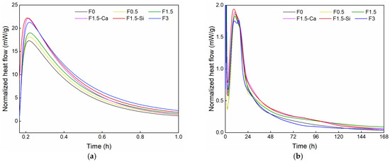 Normalized heat flow of cement paste with coir fibers of various contents and different treatments as a function of time, measured by isothermal calorimetry (a) within 1 h and (b) within 7 days.