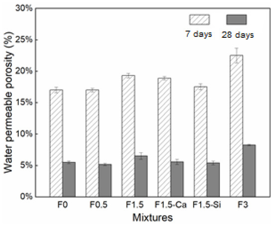 The water-permeable porosity of concrete with coir fibers of different dosages and treatments at 7 and 28 days are exhibited in Figure 7. The porosity of concrete decreases with increasing ages owing to the more adequate cement hydration. With a higher content of coir fibers, larger porosity is presented. This is due to the porous structure of coir fibers themselves, which attributes to more air (i.e., carried by fibers) and pores (i.e., contained in fibers) into the mixture. Therefore, more voids will be introduced into the concrete, contributing to a more porous structure. Whereas concrete with 0.5% fibers shows slightly less porosity as the reference, which is probably because of a denser matrix caused by a leached accelerator, compensating for the relatively low porosity created by low content of fibers. With pretreated fibers, the porosity of concrete decreases finely because the accelerated hydration caused by the treating agents reduce the pores of ITZs, as described in the following.