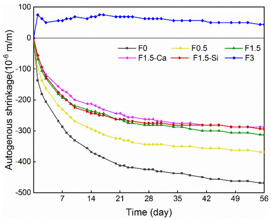 Both the drying and autogenous shrinkage tests are conducted on samples of 160 mm × 40 mm × 40 mm. After 24 h sealed curing, the specimens are demolded for shrinkage tests, and additionally, the specimens for autogenous shrinkage test are immediately sealed with a hydrophobic plastic film to avoid moisture loss. Then, samples for drying and autogenous shrinkages are exposed in an environmental chamber with a relative humidity of 50% and 99%, respectively. The zero-time of measurement is defined as the demolding time for both shrinkages. The length change along the longitudinal axis of samples is measured by a digital length comparator (±0.001 mm) at the desired ages. The initial length of all samples is straightway measured, then the followed length is measured once per working day until 28 days and three times a week until 56 days. Three specimens are tested for each mix to obtain the average values of the two shrinkages. All the tests have been carried out at a room temperature of 20 °C.