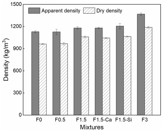 The apparent and dry densities of LWAC with coir fibers are presented in Figure 12. The apparent density of concrete is within the range of 1127 and 1369 kg/m3, and the dry density is between 960 and 1179 kg/m3, which meets the requirement of light-weight concrete. The 3, 7, and 28 days compressive strengths of all mixtures are depicted in Figure 13. The compressive strength of coir fibers reinforced LWAC increases while aging, but presents different development rates. Among the samples with different coir fiber contents, samples with 0.5% fibers give the faster development of early-age strength within 3 days, while the samples with 1.5% and 3% fibers show a higher increasing rate of later strength. For samples with different pretreated coir fibers, nano-silica treatment is more effective in enhancing the early 3-day strength than Ca(OH)2. It is in agreement with the previous hydration results, since cement hydration is positively related to the corresponding strength. Therefore, cement hydration promoted by coir fibers and treatments at certain ages consequently leads to the increased strength.