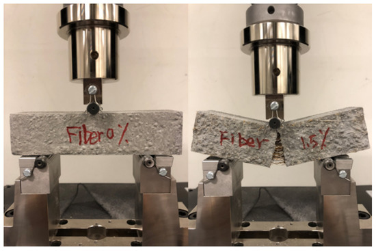 The load-deflection curves are shown in Figure 14. The initial cracking strength significantly increases with improved fiber contents and fiber treatments. After the initial cracking, a sharp drop in loads in all samples can be seen because of the reduced load-bearing capacities. Usually, a residual stress is maintained in the samples with fibers, while in the reference samples, the stress drops to zero directly. The flexural fracture characteristic is shown in Figure 15. In the left sample without coir fibers, a penetrative crack rapidly occurs in the middle of the sample, and no deformations are seen. While in the right one with coir fibers, the cracking gradually develops and a clearly deformation is presented. These phenomena are caused by the bridging effect of coir fibers as drawn from the research of both steel and synthetic fibers [18,73,74]. In addition, samples with a higher fiber content or treated fibers show a lower drop of loads. This is because of more active fibers or better bonding behaviors, allowing improved tolerance to stress, and thus higher residual strengths can be observed [19,75].