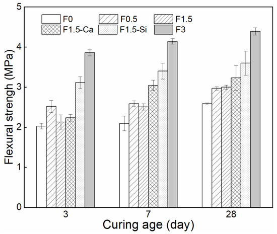 The 3, 7, and 28 days flexural strengths of each of the mixtures are presented in Figure 16. The flexural strength development of LWAC is consistent with its compressive strength, i.e., samples with 0.5% fiber content and nano-silica pretreated fiber are beneficial for early strength. Conversely, the flexural strength of LWAC increases with increased fiber content. The highest 28-day flexural strength of the samples with 3% fibers is about 4 MPa, indicating an increase of about 70% as compared to the reference samples (2.6 MPa). The main explanation can be that a load applied can be transferred to coir fibers which are more tolerant to tension than cement matrix [18,19,76], and more fibers can bear higher tensile stress for cement, resulting in a higher flexural strength. The flexural strength of the samples with 1.5% fibers shows a negligible improvement compared to 0.5% fibers, since fibers can introduce additional defects into the matrix. Moreover, both treatments slightly increase the 28-day flexural strength of concrete, and the nano-silica treatment presents a better strengthening effect because of its much improved ITZs.