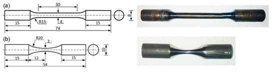 Geometric characteristics of (a) tensile and (b) ultrasonic fatigue samples (all dimensions in mm).