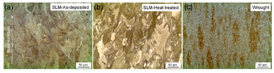 Optical microscopy (OM) images for the planes parallel to the build direction for (a) as-deposited selective laser melting (SLM) IN718, (b) SLM plus heat treatment (SLM-HT) and (c) wrought specimens.