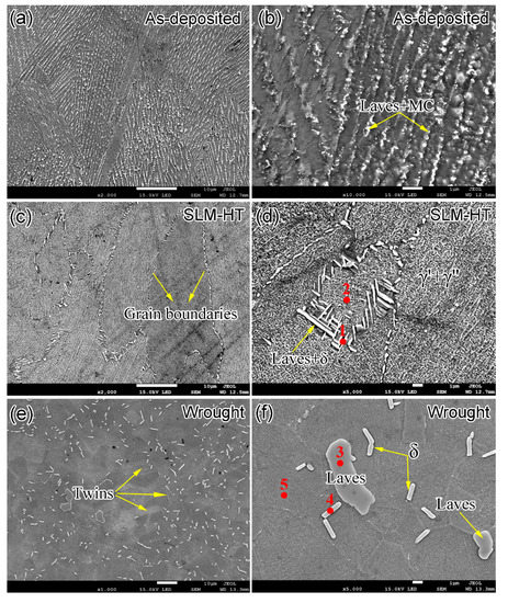 SEM images showing the microstructure of (a,b) as-deposited SLM IN718, (c,d) SLM plus heat treatment (SLM-HT) and (e,f) the wrought counterpart. Solid red circles are EDS test positions and the results are listed in Table 2.