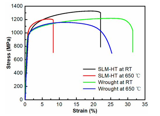 Tensile stress-strain curves of SLM-HT and wrought IN718 specimens tested at RT and 650 °C. The tensile curves of SLM alloy at RT and wrought material at 650 °C are cited from the author’s previous publications [23,24]. Adapted with permission from ref. [23]. Copyright 2020 Nanjing University of Aeronautics and Astronautics. Adapted with permission from ref. [24]. Copyright 2020 Shanghai Research Institute of Materials.