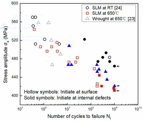 It should be noted that the SLM material is subjected to the same heat treatment specification (solution at 980 °C for 1 h and double aging at 720 °C for 8 h and then at 620 °C for 8 h, STA) traditionally used for the wrought materials, and this heat treatment is not always the best one for the SLM alloy. Previous work by Yu et al. has shown that post-heat-treatment specifications have a great effect on the microstructure evolution and the mechanical properties for the Inconel 718 alloy fabricated with laser-directed energy deposition [17]. They found that the additive manufactured IN718 alloy subjected to the homogenization at 1100 °C for 1.5 h prior to the traditional solution plus double aging (HSTA) possessed the best tensile and fracture resistance. Specifically, fracture toughness KIC of STA and HSTA samples increased by 55.8% and 90.8% compared with the as-fabricated sample. Therefore, we believe that the large difference in the microstructure and mechanical properties among the alloys subjected to various post heat treatments will significantly affect the VHCF behavior of the SLM material. However, the exact correlation is beyond the scope of the present study. The authors intend to build this correlation in future efforts.