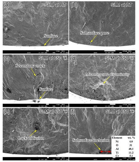Representative SEM fractographic images of SLM IN718 specimens tested at (a,b) RT and (c,d) 650 °C: (a) σa = 570 MPa, Nf = 4.4 × 105; (b) σa = 480 MPa, Nf = 3.1 × 108; (c) σa = 472 MPa, Nf = 2.3 × 107; (d) σa = 420 MPa, Nf = 2.9 × 108; (e) σa = 444 MPa, Nf = 2.3 × 108; (f) σa = 416 MPa, Nf = 9.4 × 108.
