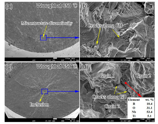 Figure 8 shows the representative SEM fractography images of wrought specimens tested at 650 °C. The fatigue cracks originated from the surface defects for the specimens in the fatigue life below 107 cycles. However, the fatigue crack initiation was triggered by microstructure discontinuities in the fatigue life regime above 107 cycles. The identification of the crack initiation sites for the wrought material with dense and fine grains is difficult. Similar to the internal initiation sites in the SLM specimens tested at 650 °C, the fatigue cracks for the wrought specimens initiate at the microstructure discontinuities, including the facets (Figure 8b) or the second phases/inclusions decorated along the grain boundaries (Figure 8d). Large amounts of smooth and flat facets with striations are observed in the vicinity of the point of crack initiation (Figure 8b). Figure 8d shows a fatigue crack source of an inclusion at the triple point of three grains, and the EDS analysis indicates that it is rich in B, O and Nb. A number of secondary cracks are present on the fracture surfaces, and the crack growth mode is intergranular. This feature is ascribed to the fine grains with grain boundaries decorated by large amounts of brittle Laves and δ phases (Figure 3f), which can break under cyclic deformation at high temperature and lead to the intergranular secondary cracks.