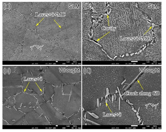 In order to investigate the microstructure evolution and the fatigue crack initiation mechanism, SEM examinations are conducted on the planes cut from the run-out (109 cycles) SLM and wrought specimens (Figure 9). As mentioned above, Laves and δ phases can precipitate and grow during the high-temperature fatigue testing process. No obvious differences can be found between the microstructures before (Figure 3c) and after (Figure 9a) fatigue test for the SLM specimen. However, as shown in Figure 9c, more rod or needle-like Laves and δ phases can be observed in the wrought specimen after experiencing a long fatigue life of 109 cycle (the corresponding during time is 14 h) than those in the same material before the fatigue test (Figure 3e). The majority of these precipitates are δ phase. Since the Nb-rich Laves and δ phases are prone to nucleate along the grain boundaries due to the lower activation energy barrier at elevated temperature, grain refinement can lead to the increase in the length and area of the grain boundaries, thereby promoting the Laves and δ phases. Recrystallized grains with a small grain size of about 5 μm were formed in the wrought alloy during the hot forging process (Figure 4c). The grain size for the SLM material, however, was is about 10 μm in the plane perpendicular to the build direction, and it was larger in the plane with coarse columnar grains parallel to the build direction. As such, the wrought alloy provides far more grain boundaries acting as the nucleation sites of the Laves and δ phases. This can explain the more and larger Laves and δ phases in the wrought alloy after fatigue testing. The loss of coherent reinforcement between the brittle Laves or δ phases and the matrix under cyclic stress at elevated temperature can lead to grain boundary embrittlement and provide the crack propagation path [29]. This is confirmed by the SEM examinations for the run-out specimens. Figure 9b shows the cavities in the interface of the Laves or δ phases and the matrix along the grain boundaries. The linkage of these cavities is critical for the formation of the microstructural small fatigue crack. A microcrack along the grain boundary is also observed in the wrought specimen (Figure 9d). Based on the analysis above, the size and distribution of Laves or δ phases play an important role in the fatigue crack initiation in the VHCF regime at elevated temperatures.
