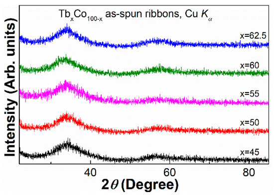XRD patterns of the TbxCo100−x (x = 45, 50, 55, 60, 62.5) as-spun ribbons.