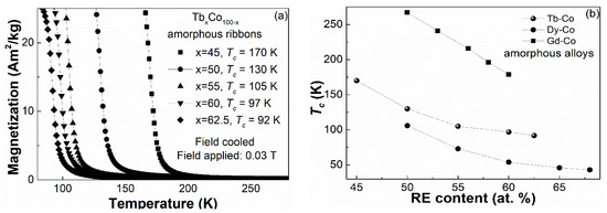 (a) FC M–T curves of the TbxCo100-x (x = 45, 50, 55, 60, 62.5) amorphous ribbons; (b) the relationship between the Tc and the RE element content in the TbxCo100-x, DyxCo100-x and GdxCo100-x amorphous alloys.