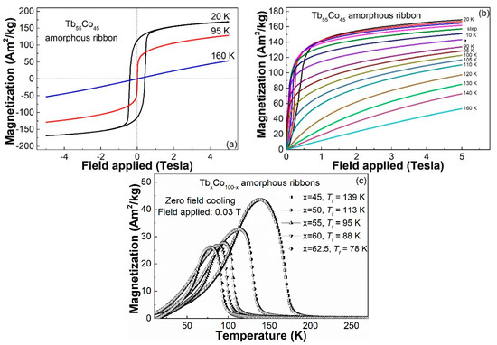 In our preliminary work, the Gd–Co amorphous alloys are soft magnetic with almost zero hysteresis because the stable half full electron arrangement in the 4f shell of Gd atom does not produce orbital momentum and thus Gd has a relatively small magneto-crystalline anisotropy. In contrast, the unstable electronic arrangement of the 4f shell in the Tb or Dy atom gives rise to the existence of orbital momentum and produces a large magneto-crystalline anisotropy, which is expected to result in a relatively high coercivity at low temperature in Tb–Co and Dy–Co amorphous alloys. As shown in Figure 3a, the Tb55Co45 amorphous ribbon is hard magnetic with a coercivity of ~326 kA/m at 20 K, soft magnetic at 95 K and paramagnetic at 160 K. The high coercivity at 20 K is due to the random magnetic anisotropy (RAM) which exists in Tb-based amorphous system [20,21,22], which will lead to the preferential orientation between the magnetic moments, destroy the macroscopic effective anisotropy directions of the magnetic order and thereby produce the hysteresis.