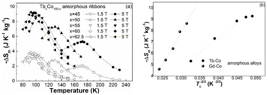 (a) The (−ΔSm)-T curves of the TbxCo100−x (x = 45, 50, 55, 60, 62.5) amorphous ribbons under the magnetic field of 1.5 T and 5 T; (b) the linear fittings of Tc−2/3 vs. −ΔSmpeak plots for the Gd–Co and Tb–Co amorphous alloys.