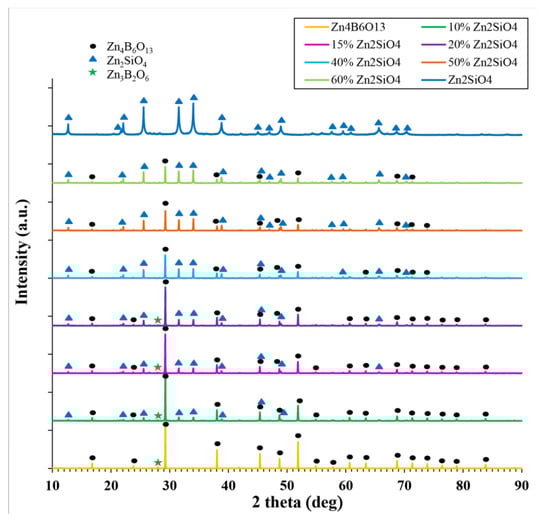 Two dominant crystalline phases were detected—Zn2SiO4 (hexagonal crystallographic system, R-3 group) and Zn4B6O13 (cubic crystallographic system, I-43m group). For the samples containing 10, 13, 15, and 20% willemite, another zinc borate Zn3B2O6 was found as an additional crystalline phase. The amount of this phase was 7% for 87% Zn4B6O13–13% Zn2SiO4 ceramic and about 5% for the other materials from this group. For the ceramics with 40, 50, and 60% willemite, only two starting crystalline phases were found on the diffraction patterns. On the basis of data reported by other authors [39], in the ZnO–SiO2–B2O3 system, no reaction between zinc borate and zinc silicate should be expected.