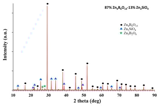 Diffraction pattern of 87% Zn4B6O13–13% Zn2SiO4 ceramic sintered at 930 °C.