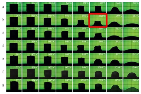 Selected images from a heating microscope for Zn4B6O13–Zn2SiO4composites: (a) 10% Zn2SiO4, (b) 13% Zn2SiO4 (in the red frame—melting point of the eutectic), (c) 15% Zn2SiO4 (d) 20% Zn2SiO4, (e) 40% Zn2SiO4, (f) 50% Zn2SiO4, (g) 60% Zn2SiO4.