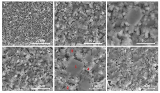 SEM images in Figure 4 illustrate the microstructure of the Zn4B6O13–Zn2SiO4 composites. All ceramics are made of evenly distributed grains of zinc borate and zinc silicate and have a small closed porosity. The brighter areas can be attributed to Zn2SiO4 grains, for which the contribution of elements with higher atomic numbers (Si and a higher content of Zn) is greater than in the case of Zn4B6O13 (B and a lower content of Zn). Some borate grains are distinctly larger than those of the silicate (point 1 in Figure 4e), although small borate grains are also observed. The results of the EDS analysis presented in Table 2 at the points marked in Figure 4e indicate that point 1 corresponds to zinc borate grain, and point 4 can be attributed to zinc silicate grain. However, the EDS results are ambiguous due to the proportion of Zn, Si, and B atoms that differ significantly from the stoichiometric ratio (this can be explained by an imprecise detection of boron).