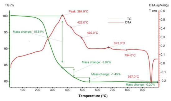 Figure 5 presents the results of the thermal analysis of a green ceramic tape based on 50% Zn4B6O13−50% Zn2SiO4 composite. The DTA curve shows a large exothermic peak in the temperature range 220–520 °C, which corresponds to a significant weight loss on the TG curve. This is the effect of burnout of the organic components of the green tape, mainly the binder, which is polyvinyl butyral.